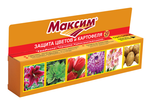 «Максим» — Препарат защитно-контактного действия для защиты от болезней луковичных (тюльпаны, гладиолусы, лилии и т.д.), георгинов, пионов, корней и корневищ других цветов, а также семенного картофеля. Создает защитный барьер на поверхности посадочного материала и в прикорневой зоне в почве. Эффективен против всех видов гнилей, плесеней, фузариоза, ризоктониоза, парши и других заболеваний. Защищает растения от болезней в течение всего периода роста и хранения.